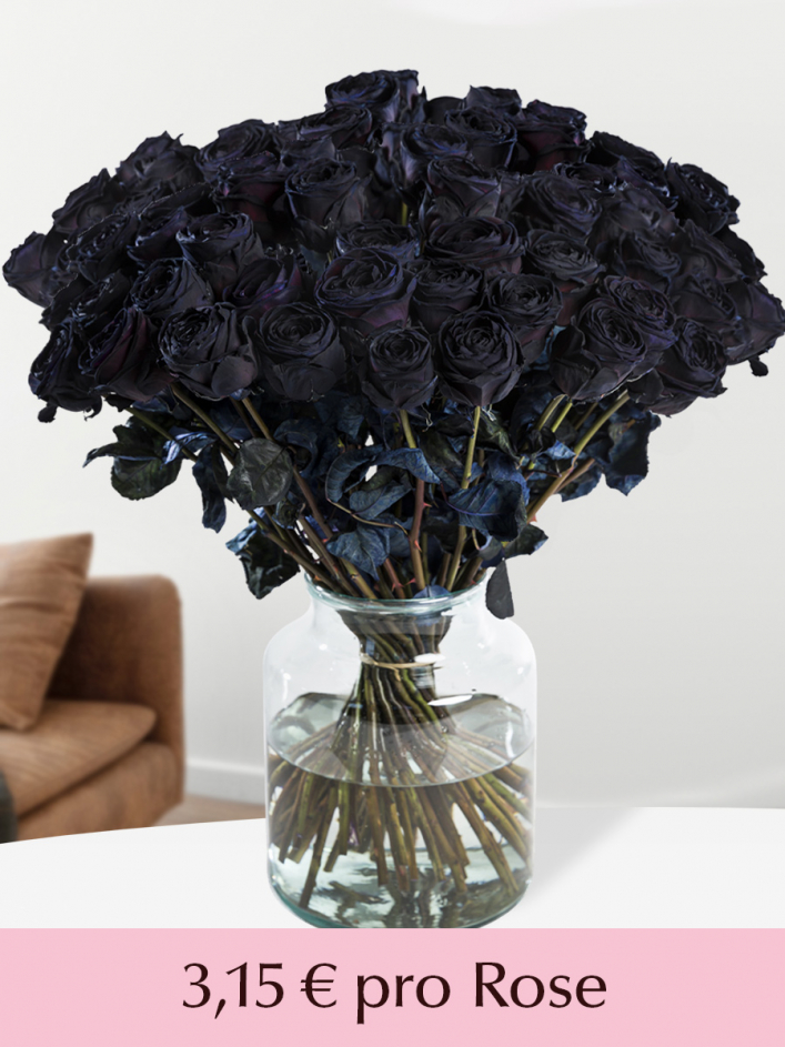 Du kannst aus einem Strauß von 50 bis 99 schwarzen Rosen wählen. Das sind echte Rosen, die eine pechschwarze Farbe haben. Die Rosen werden frisch vom Züchter geschnitten, gefärbt und zu unserer Binderei gebracht. Dort stellen unsere Floristen einen wunderschönen Strauß in der von dir gewählten Anzahl zusammen! Wusstest du, dass nur wenige Menschen zu Hause eine Vase für so große Sträuße haben? Du kannst es dem Empfänger also leicht machen, indem du eine Vase zu deiner Bestellung hinzufügst. Stöbere hier durch alle unsere Vasen, um die richtige für deinen Strauß zu finden.